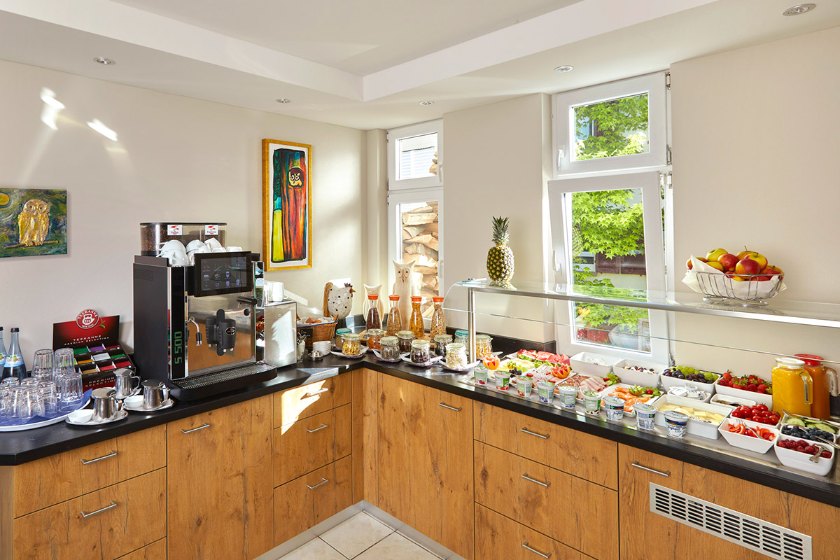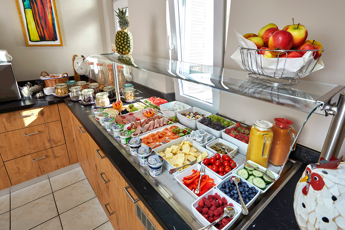 Unser reichhaltiges und abwechslungsreiches Frühstücksbuffet bietet für jeden Geschmack das Richtige, ob gesundes Fit-Frühstück mit Joghurt und Vollkorn, leckeres Genießer-Frühstück mit frischem Obst und Brötchen oder ein typisch badisches Frühstück mit Ei und Aufschnitt.
